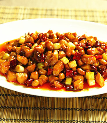 宮保雞丁選用雞肉為主料,佐以花生米、黃瓜、辣椒等輔料烹制而成。 紅而不辣、辣而不猛、香辣味濃、肉質(zhì)滑脆。由于其入口鮮辣,雞肉的鮮嫩配合花生的香脆。