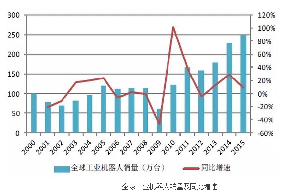 根據(jù)國際機(jī)器人聯(lián)合會(huì)IFR的統(tǒng)計(jì),過去十多年,全球工業(yè)機(jī)器人景氣度較高,2015年,全球工業(yè)機(jī)器人總銷售量達(dá)到248000臺(tái),同比增長15%,2002-2008年,全球工業(yè)機(jī)器人年復(fù)合增長率為8.6%,2009-2015年全球工業(yè)機(jī)器人年復(fù)合增長率為23.5%,是過去6年的2.7倍,近幾年全球工業(yè)機(jī)器人增速明顯加快。